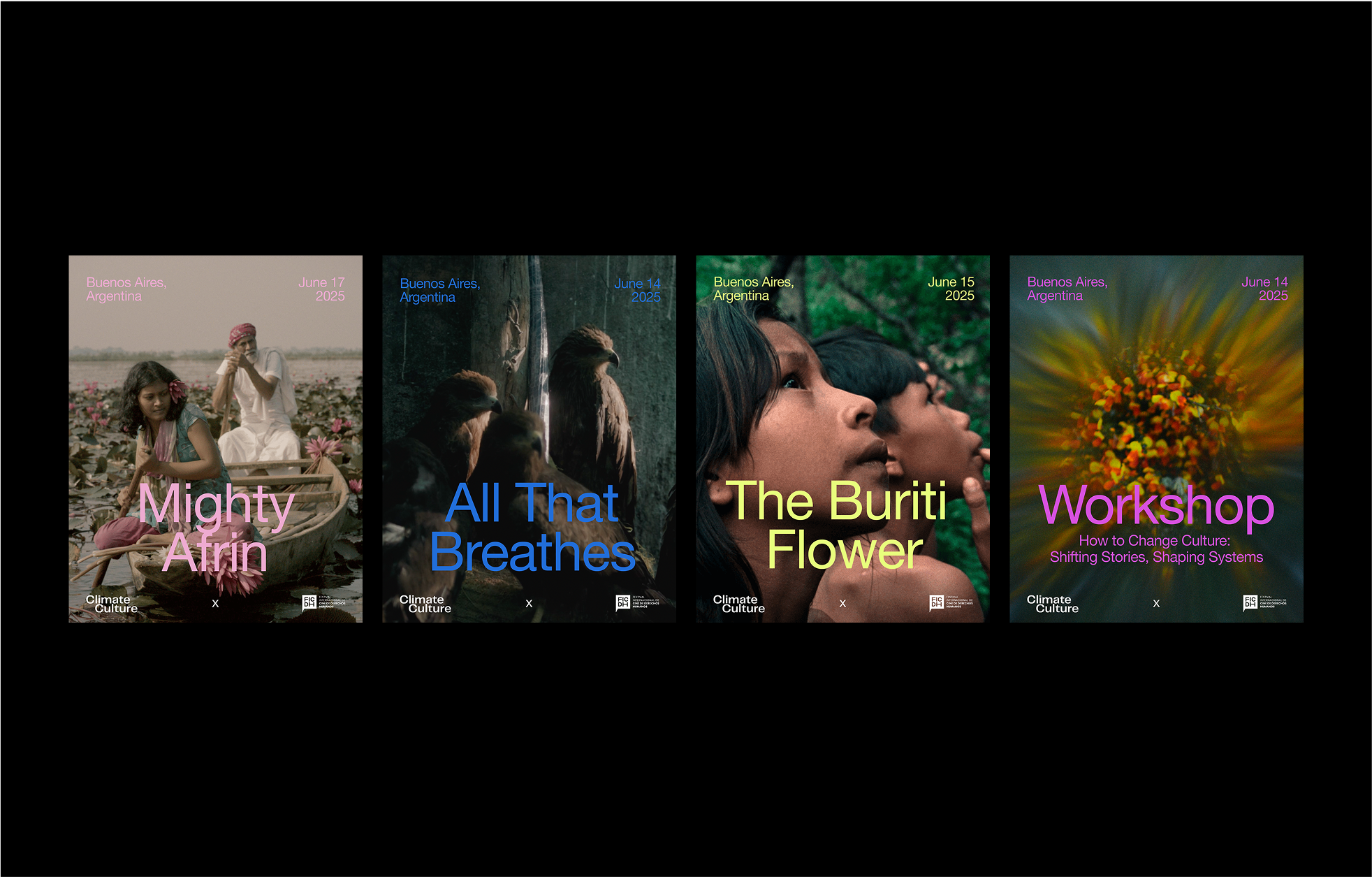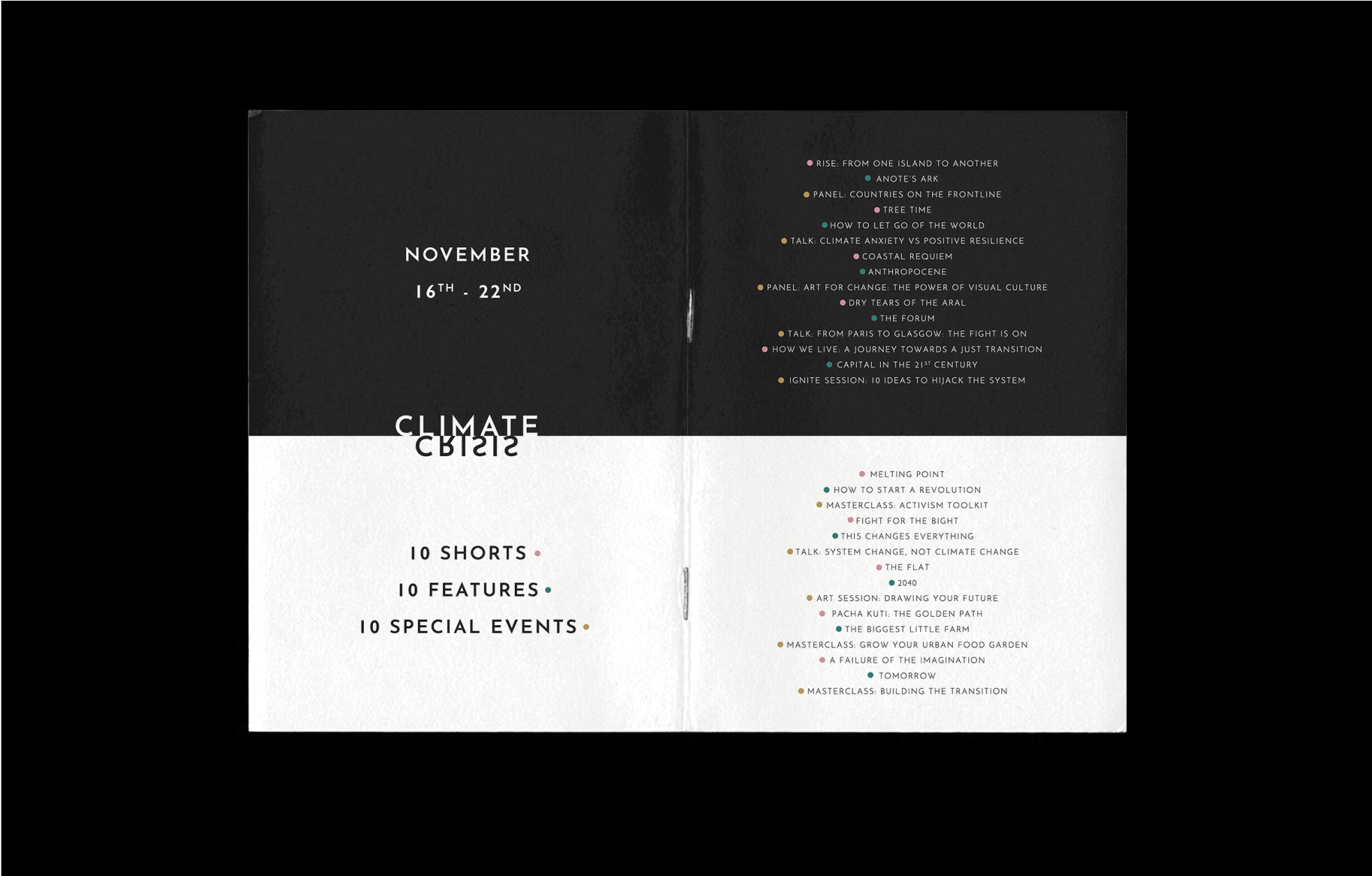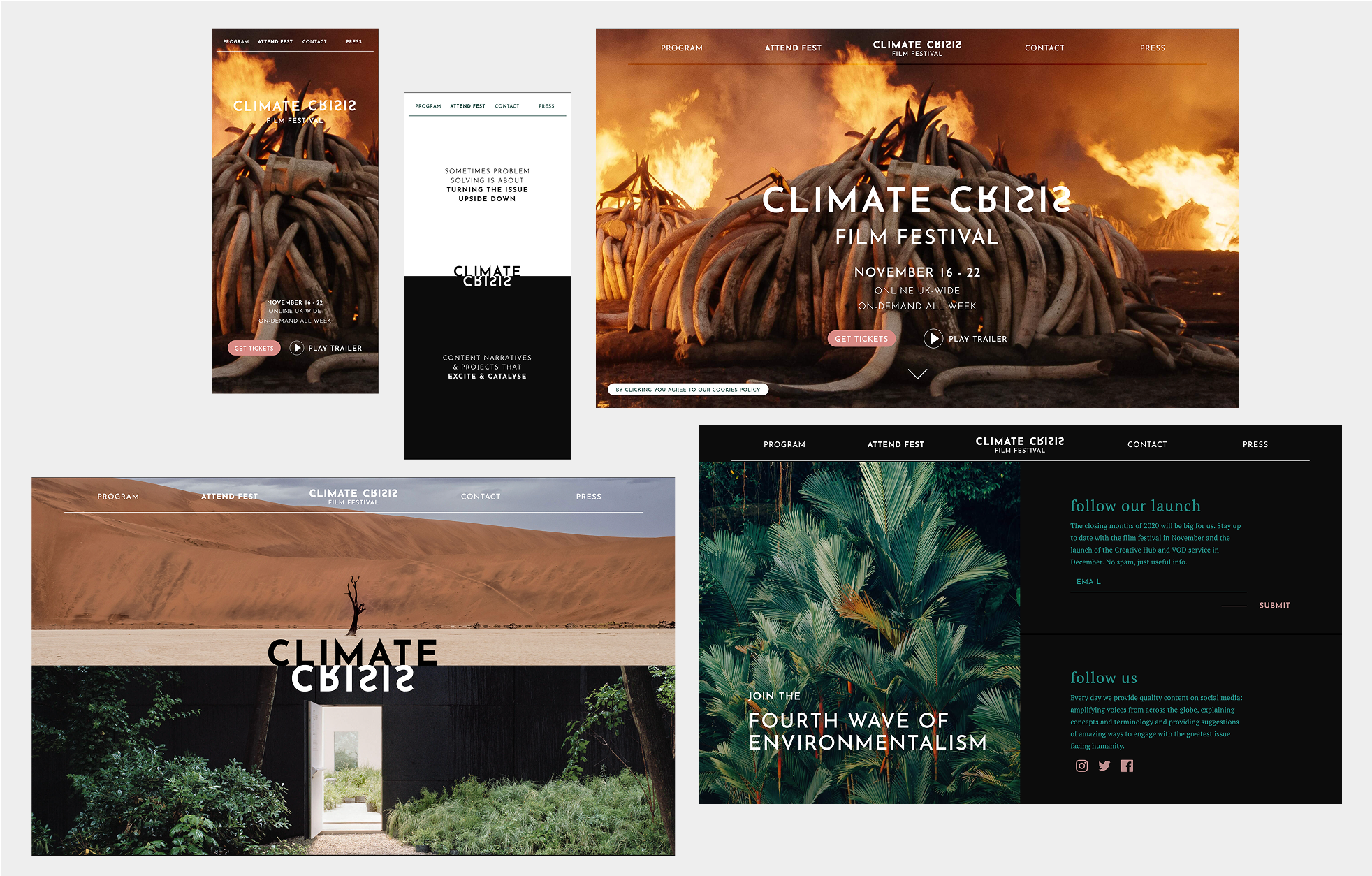Branding and visual identity for the third edition of the Climate Crisis Film Festival — a hybrid event streaming worldwide and hosting in-person screenings at COP26. The project involved creating the entire brand from scratch under an extremely tight deadline, producing assets across social media, the festival website, streaming platform, outdoor posters, billboards, event signage, press kits, thumbnails, and more. The result was a cohesive, high-impact identity that supported the festival’s growth into one of the world’s largest environmental film festivals, reaching 220k viewers in 143 countries. The branding and website received consistent praise from partners and stakeholders, reinforcing the festival’s position on a global stage.