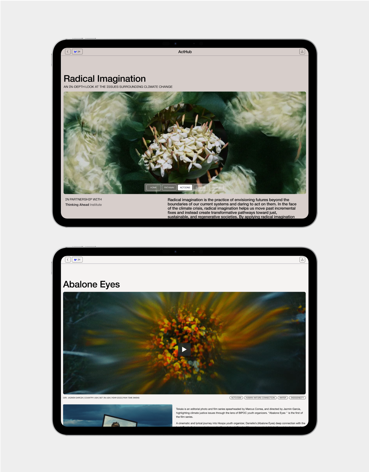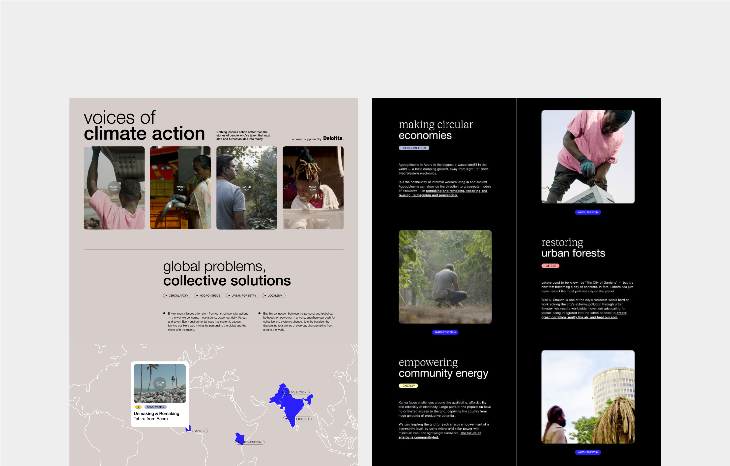 Voices of Climate Action is a series of four short films and a digital experience, commissioned by Deloitte and filmed in Ghana, Kenya, India, and Pakistan. Each film follows a local changemaker tackling climate challenges with solutions rooted in their community—approaches with lessons for us all. From the outset, the project was conceived as both film and digital. We designed an immersive microsite that paired each story with context on systemic solutions and clear pathways for action—guiding viewers from learning to supporting, participating, and leading. Alongside the site, we developed a strong visual identity for the films, which extended into a social media campaign amplifying their reach.