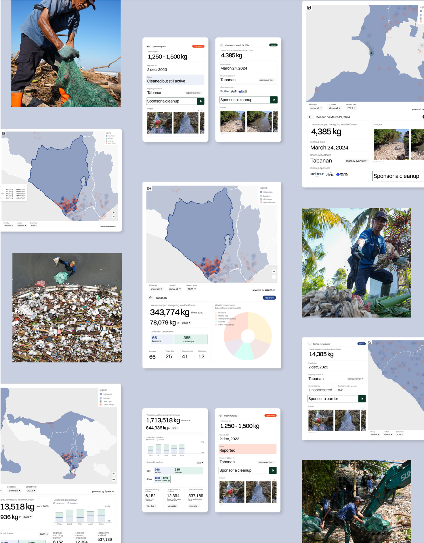 Sungai Watch is one of the most exciting new NGOs tackling ocean plastics in Indonesia. Since 2020, they’ve been intercepting waste in rivers before it reaches the sea, collecting it, and sending it to their centres. From the start, they’ve tracked the plastic products, brands, and locations of the waste — creating an incredibly valuable dataset. We brought this data to life in an interactive map, giving citizens, activists, and officials a clear view of where interventions are needed most, and providing Sungai Watch with a scalable tool to supercharge their impact.