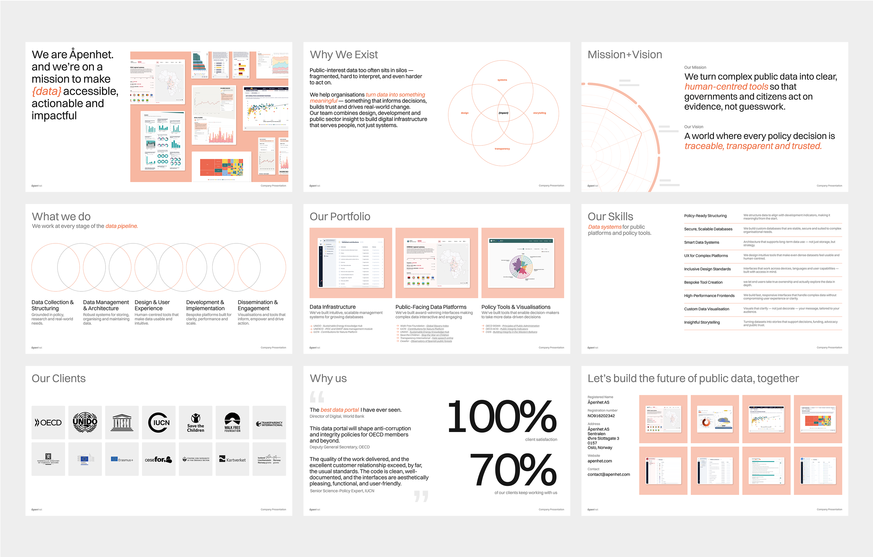 Åpenhet builds tools for open, transparent governance. The brand reflects that ethos: minimal, precise, and grounded in clarity. The website is structured to foreground complex public sector work with simplicity and trust—pairing a neutral visual language with carefully structured content that communicates both capability and purpose.